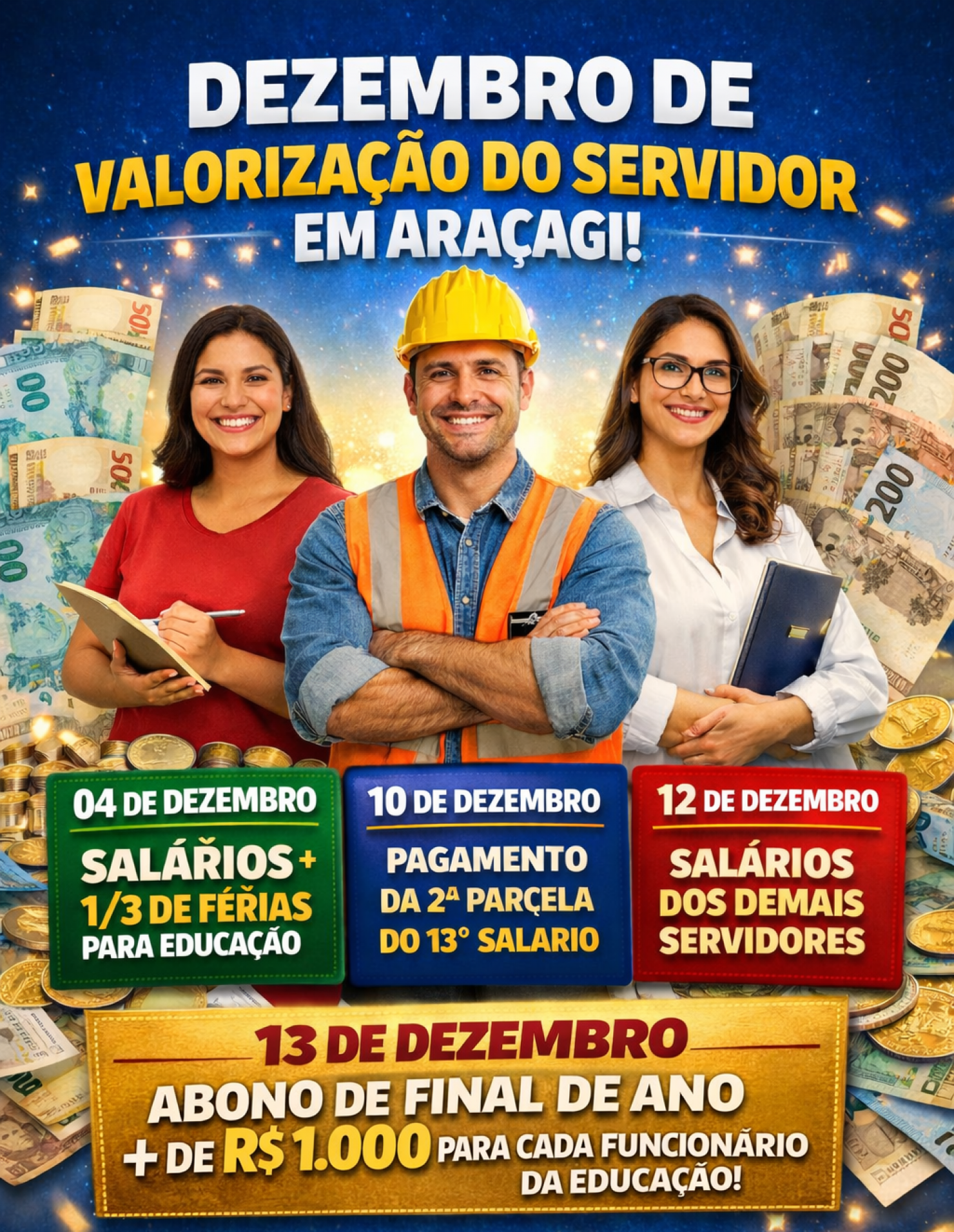 Além disso, a segunda parcela do décimo terceiro salário foi creditada no dia dez de dezembro para os servidores municipais. Para encerrar o mês com ainda mais reconhecimento, os profissionais da educação receberam, no dia treze de dezembro, um abono de final de ano superior a mil reais. Esse conjunto de pagamentos evidencia um dezembro marcado por responsabilidade fiscal, planejamento e valorização do servidor, reafirmando o compromisso da gestão municipal com quem trabalha diariamente pelo crescimento de Araçagi.